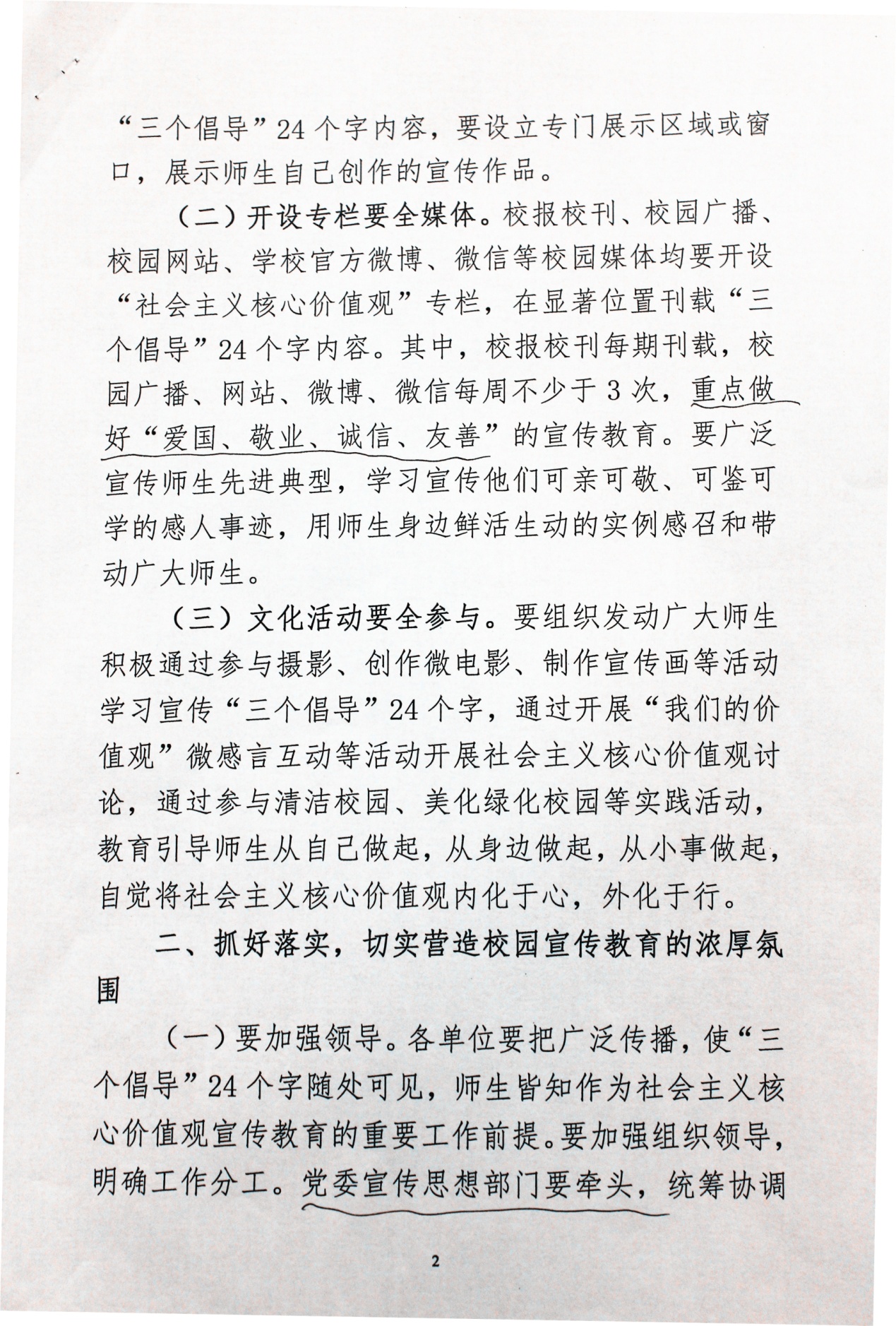 请各部门高度重视社会主义核心价值观宣传教育工作,深入推动落实《关于推动教育系统培育和践行社会主义核心价值观的实施办法》,组织全校围绕“三个倡导”24个字,进一步集中开展宣传教育,广泛传播,在我校营造更加浓厚的宣传教育氛围。