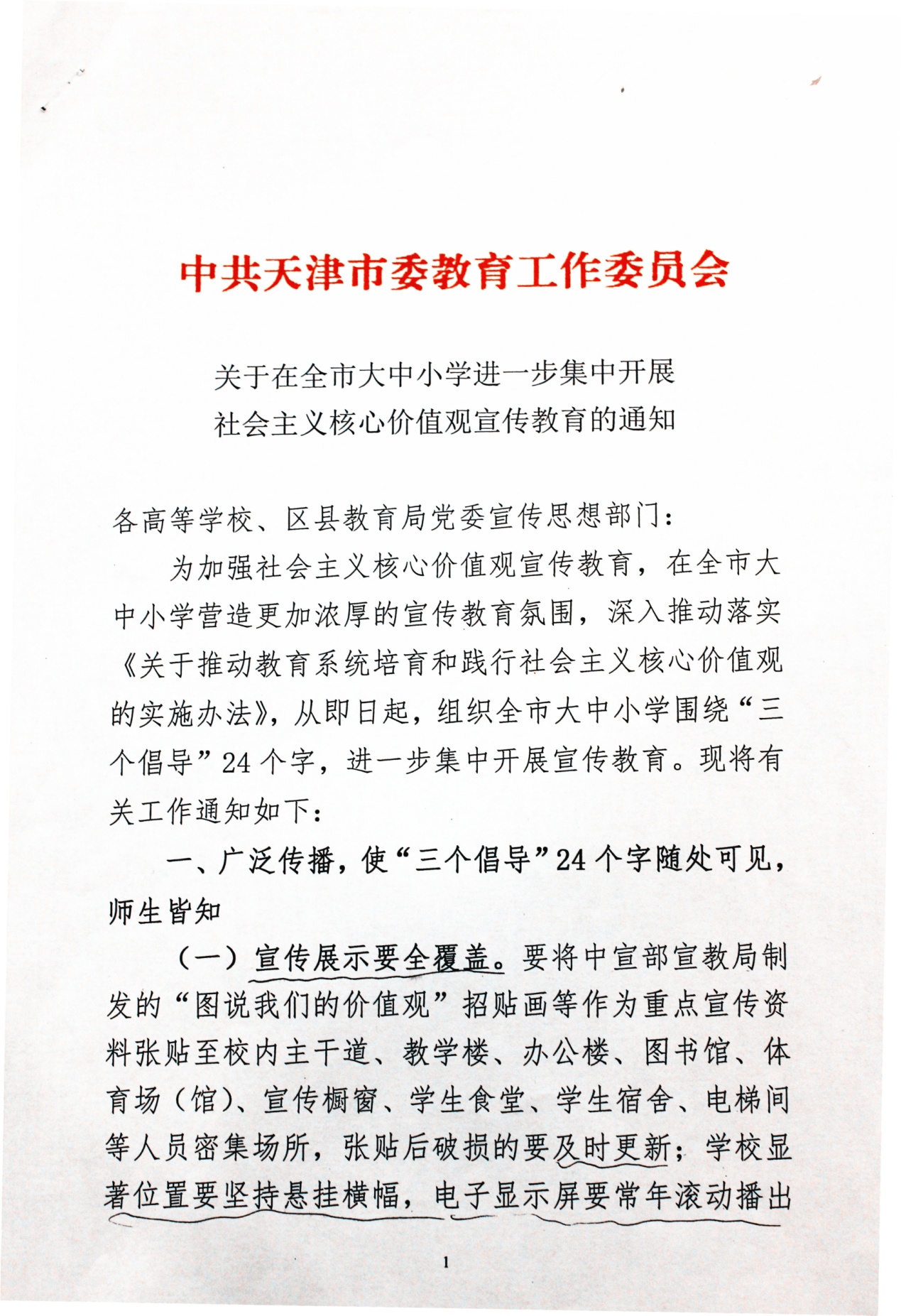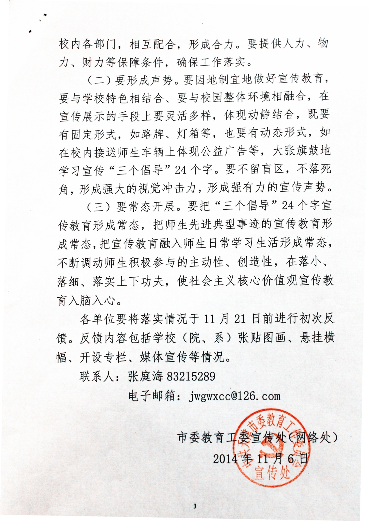 请各部门高度重视社会主义核心价值观宣传教育工作,深入推动落实《关于推动教育系统培育和践行社会主义核心价值观的实施办法》,组织全校围绕“三个倡导”24个字,进一步集中开展宣传教育,广泛传播,在我校营造更加浓厚的宣传教育氛围。