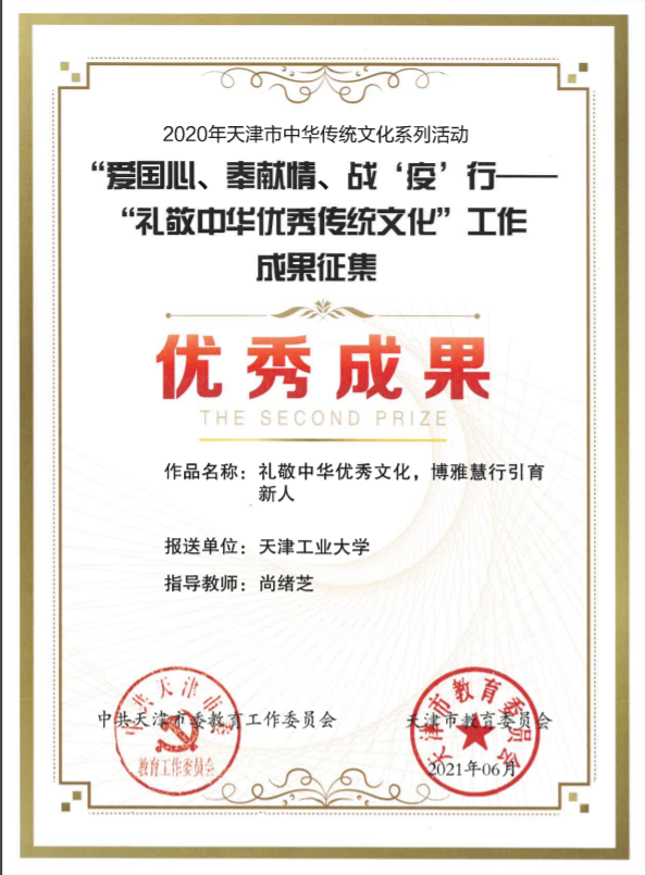 《礼敬中华优秀文化,博雅慧行引育新人》的作品,在2020年天津市中华传统文化系列活动“爱国心、奉献情、战疫行”------礼敬中华优秀传统文化工作成果征集活动中,荣获优秀成果奖。