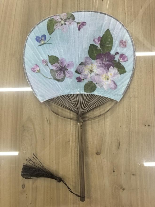 押花艺术是一种将天然花卉、叶片等植物材料经过脱水、压制等处理后,保留其自然形态和色彩,再通过创意设计拼贴成画的工艺。它融合了植物学、美学和手工技艺,既能展现自然之美,又充满艺术表现力。书院引导选课师生运用专业的工具,经过脱水、处理和保色专业处理,采用学校春日校园里的海棠花以及花草押花制作成押花团扇以及文创作品。