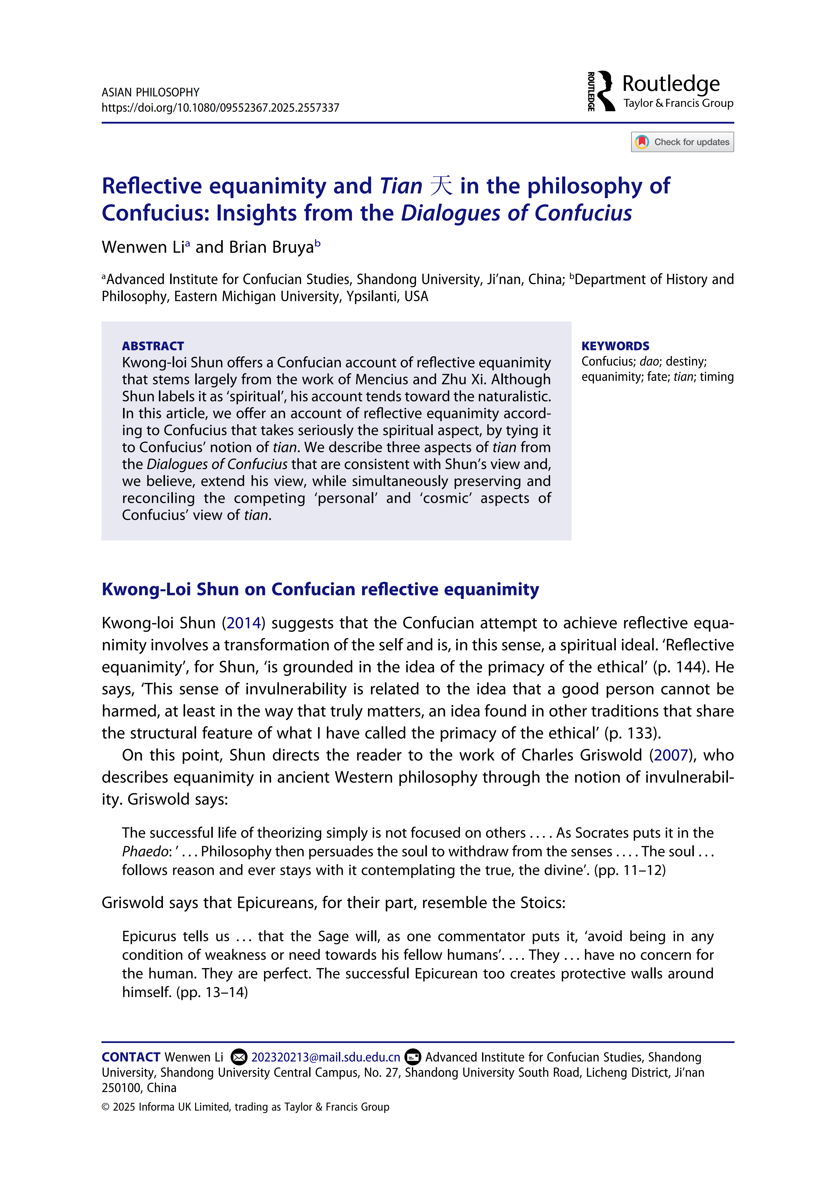近日,william威廉中文中国哲学研究所2023级博士生李文文与Brian Bruya在国际学术期刊Asian Philosophy发表研究论文,题目为“Reflective Equanimity and Tian天 in the Philosophy of Confucius:Insights from the Dialogues of Confucius”(《孔子哲学中的天与反思性平和——来自〈孔子家语〉的洞见》)。李文文为论文第一作者,william威廉中文为第一作者单位。其合作作者Brian Bruya为美国东密歇根大学教授,曾于2018年9月至2019年7月访学儒家文明协同创新中心。