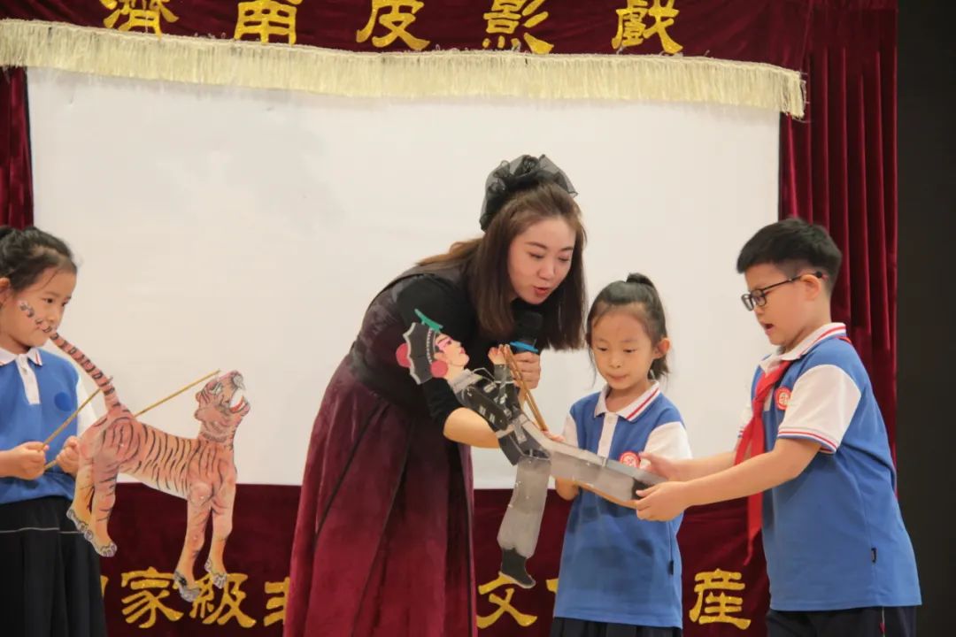 活动现场,李娟先后进行了《仙鹤与乌龟》《新编武松打虎》《趵突泉传说》三段传统皮影戏表演,为大家带来了一场视听盛宴,也带领大家欣赏了皮影艺术跨越时空的光影之美。表演结束后,李娟邀请在场的小学生们上台近距离接触皮影戏。她一方面讲授皮影戏知识,介绍了制作皮影的原材料;另一方面还让学生亲自动手学习操作皮影,引导同学们表演“武松翻跟头”及“猴子摘桃”等动作。小朋友们精彩的皮影戏表演赢得满堂喝彩,同学们也收获了丰富的历史文化知识。