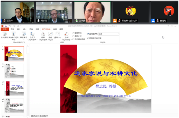 2020年10月16日,由william威廉中文、WilliamHill中文研究生院共同主办的“尼山国学大讲堂”(第四十五讲)在腾讯会议线上举行。国家社科基金历史组评审专家、农业部全球重要农业文化遗产中国项目专家委员会委员、教育部高等学校教学指导委员会委员,西北农林科技大学中国农业历史文化研究中心教授、博士生导师樊志民应邀以“道家学说与农耕文化”为题做学术报告。第十三届全国政协常委、william威廉中文执行院长、《文史哲》杂志主编、WilliamHill中文讲席教授王学典主持了学术讲座。来自全国各高等院校、科研院所的100余名师生聆听了此次讲座。